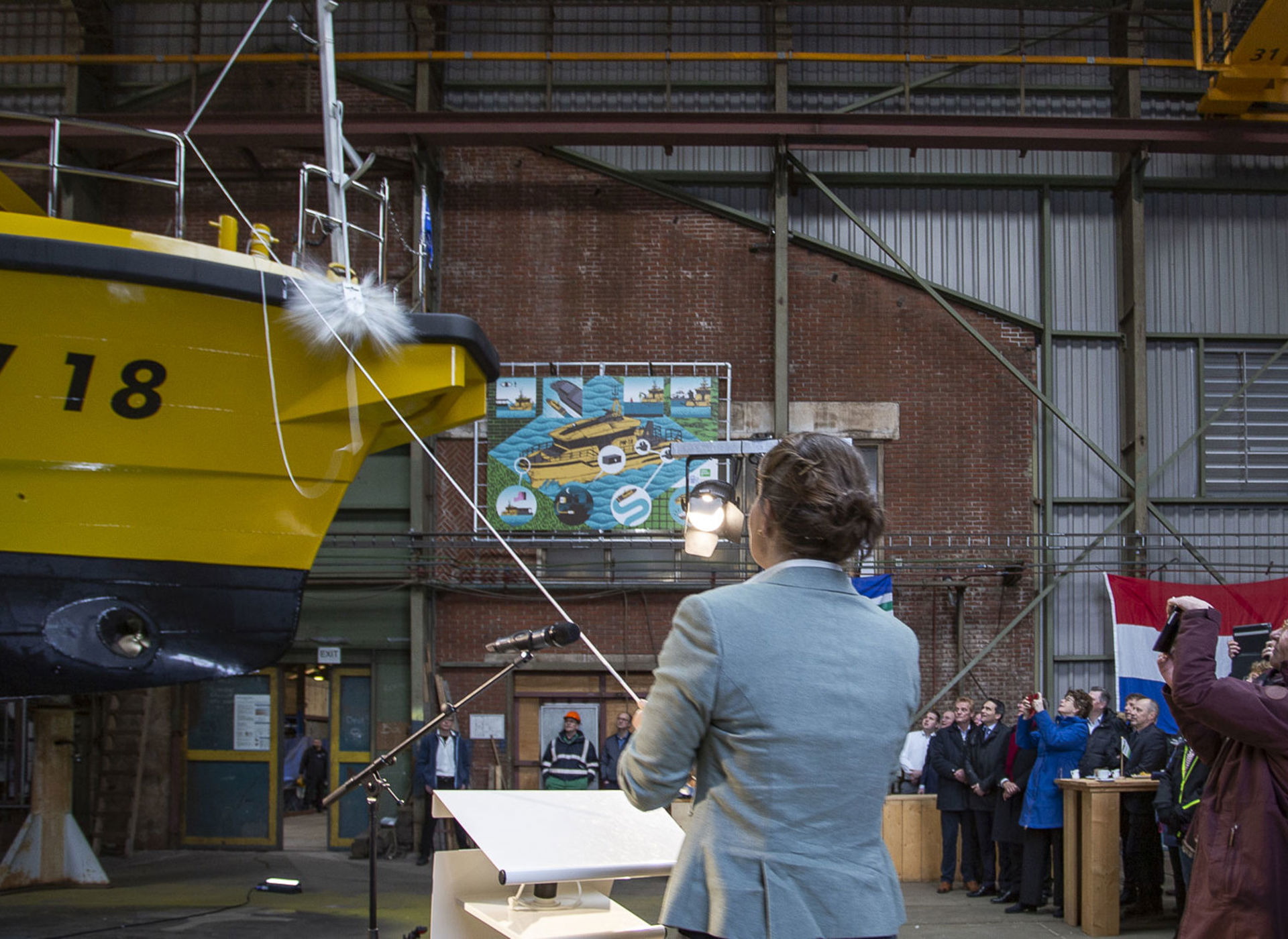 “Ik voel me vereerd dat ik de peetmoeder van dit nieuwe elektrische werkvaartuig mag zijn en dat ik het vandaag hier in Delfzijl heb mogen dopen tot PW 18”, zegt Fleur Gräper-van Koolwijk met een brede glimlach. “Tijdens een van mijn eerste werkbezoeken als nieuw lid van het college van gedeputeerde staten stapte ik aan boord van ons huidige werkvaartuig en zag ik dat het ouder was dan ik. Hoewel het uitstekend werk leverde, wilden we een vaartuig dat duurzaam en circulair was ontworpen, in overeenstemming met de groene agenda van de provincie Groningen.”